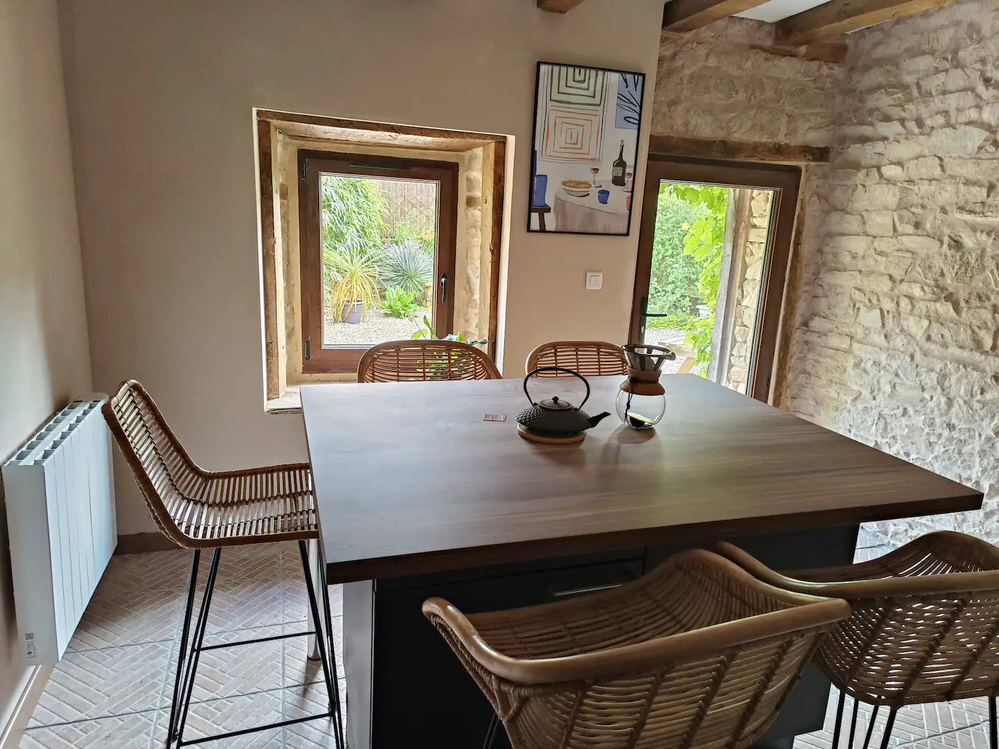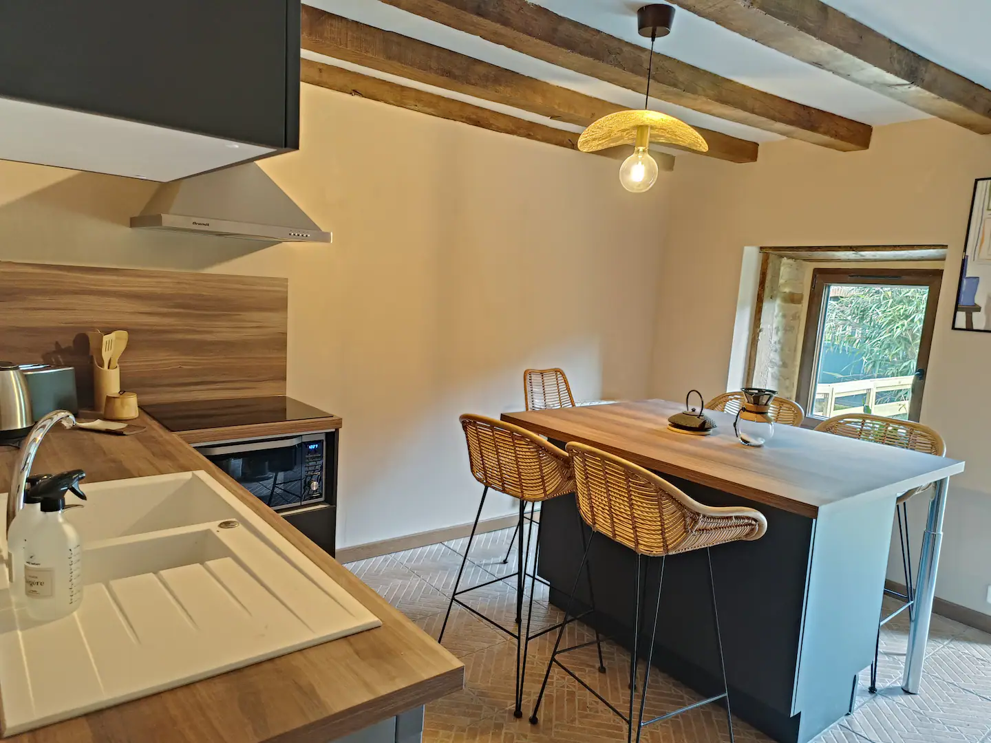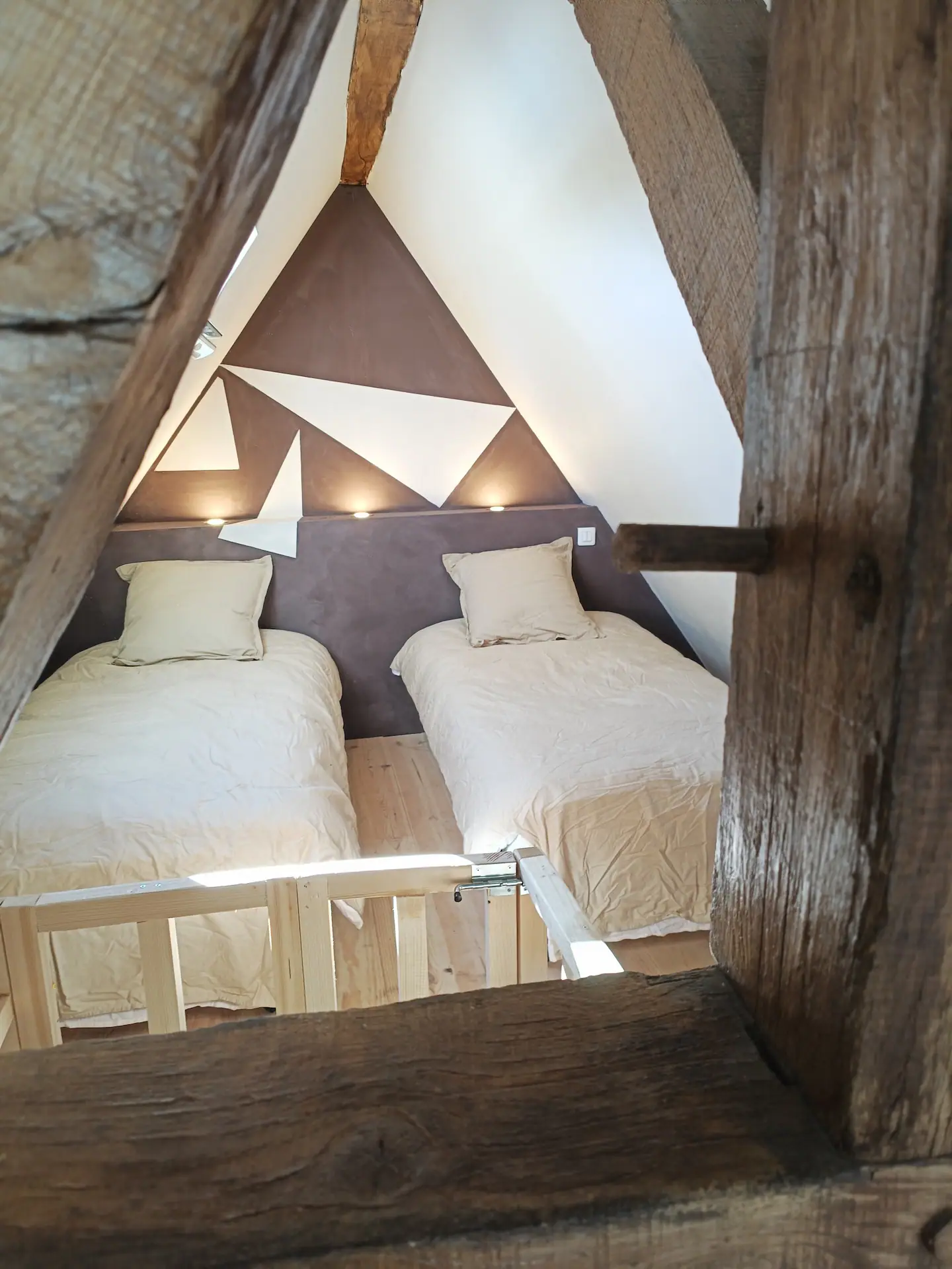 L’aménagement de notre gîte s’inspire d’un séjour dans une cabane avec ses trois niveaux, ses deux entrées, son escalier en colimaçon et son échelle, ses poutres apparentes sur le plafond en bois ; une ambiance cosy où il fait bon vivre…